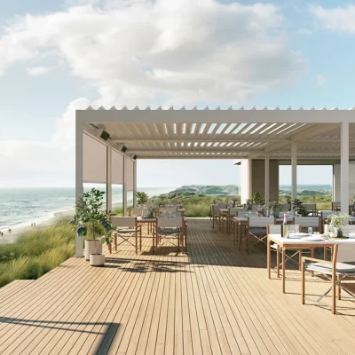 Lamaxa L50 Line ist die ideale Lösung, um große Flächen verschatten und vor Witterung schützen zu lassen. Dazu können mehrere Lamaxa Dachsysteme mit nur einem mittigen Pfosten an der langen oder kurzen Seite aneinandergereiht werden. Und zwar freistehend, mit Fassadenanbindung oder in Sternform. Wie Sie sich auch entscheiden: Sie schaffen immer ein einladendes Flair für Ihre Gäste.